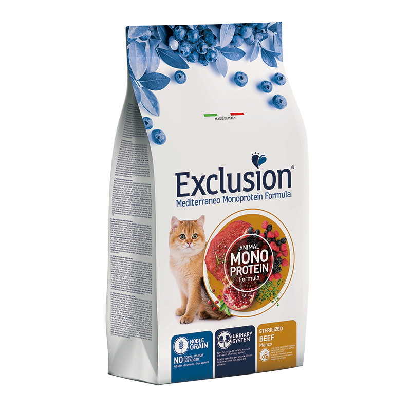 Exclusion Mediterraneo Monoprotein Formula – Noble Grain é un alimento completo e bilanciato, formulato con una sola fonte proteica animale disidratata, per una ricetta chiara ed essenziale, e con solo un cereale nobile di alta qualità. La specifica formulazione aiuta il buon funzionamento delle vie urinarie ed è preservato con antiossidanti naturali. È realizzato con una innovativa ricetta con Superfood della tradizione Mediterranea: melagrana, more, lamponi e mirtilli neri. È arricchito con Psyllium per aiutare a contrastare la formazione dei boli di pelo. Senza grasso di pollo, frumento, soia e mais aggiunti.