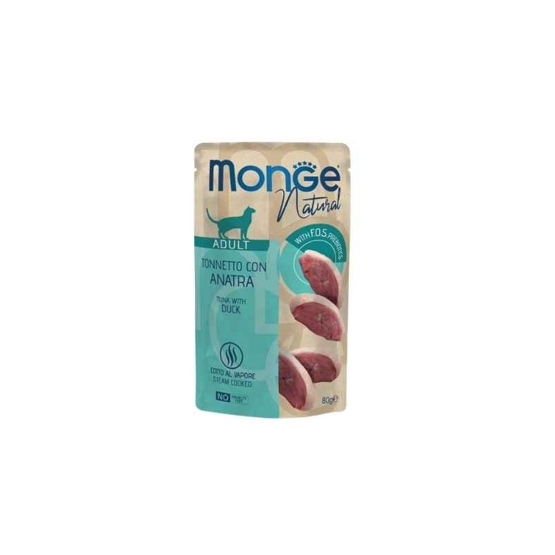 Regala al tuo gatto un'esperienza gastronomica unica con Monge Cat Natural Tonno con Anatra, una prelibata combinazione di sapori presentata in una comoda busta da 80 grammi.