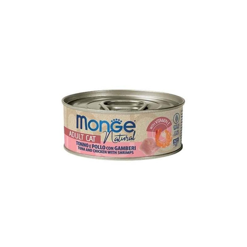 Offri al tuo gatto una prelibatezza irresistibile con Monge Cat Natural Tonno e Pollo con Gamberetti. Questa lattina da 80 grammi presenta una combinazione deliziosa di tonno, petto di pollo e gamberetti, offrendo un mix equilibrato di sapori e nutrienti per soddisfare il palato e le esigenze nutrizionali del tuo felino.