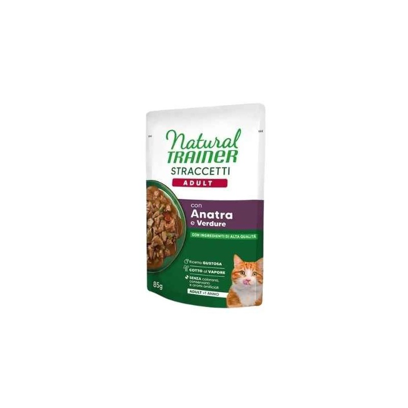 Alimento per gatti adulti sterilizzati: Ideale per gatti adulti sterilizzati, il Natural Trainer Cat Straccetti Sterilizzato Anatra e Verdure 85 g offre un pasto gustoso e nutriente.