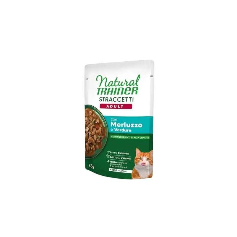 Alimento per gatti adulti sterilizzati: Ideale per gatti adulti sterilizzati, il Natural Trainer Cat Straccetti Sterilizzato Merluzzo e Verdure 85 g offre un pasto gustoso e nutriente.