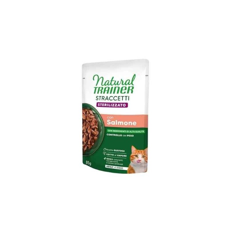 Alimento per gatti adulti sterilizzati: Ideale per gatti adulti sterilizzati, il Natural Trainer Cat Straccetti Sterilizzato Salmone 85 g offre un pasto gustoso e nutriente.